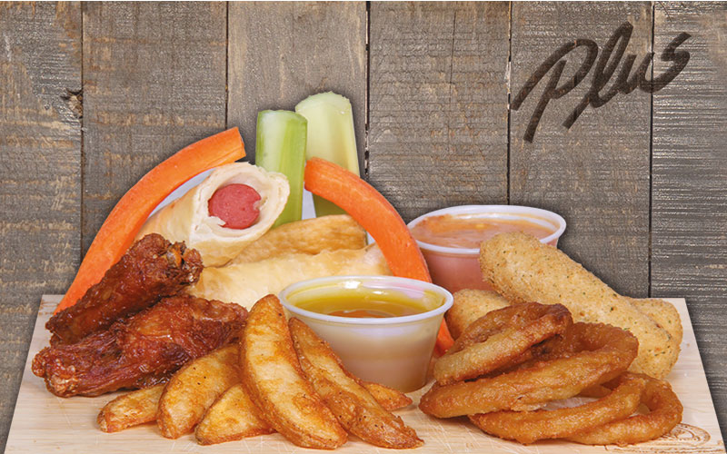 AILES DE POULET, BÂTONNETS DE FROMAGE, SAUCISSES TORTILLAS, PATATES GRECQUES, RONDELLES D’OIGNON